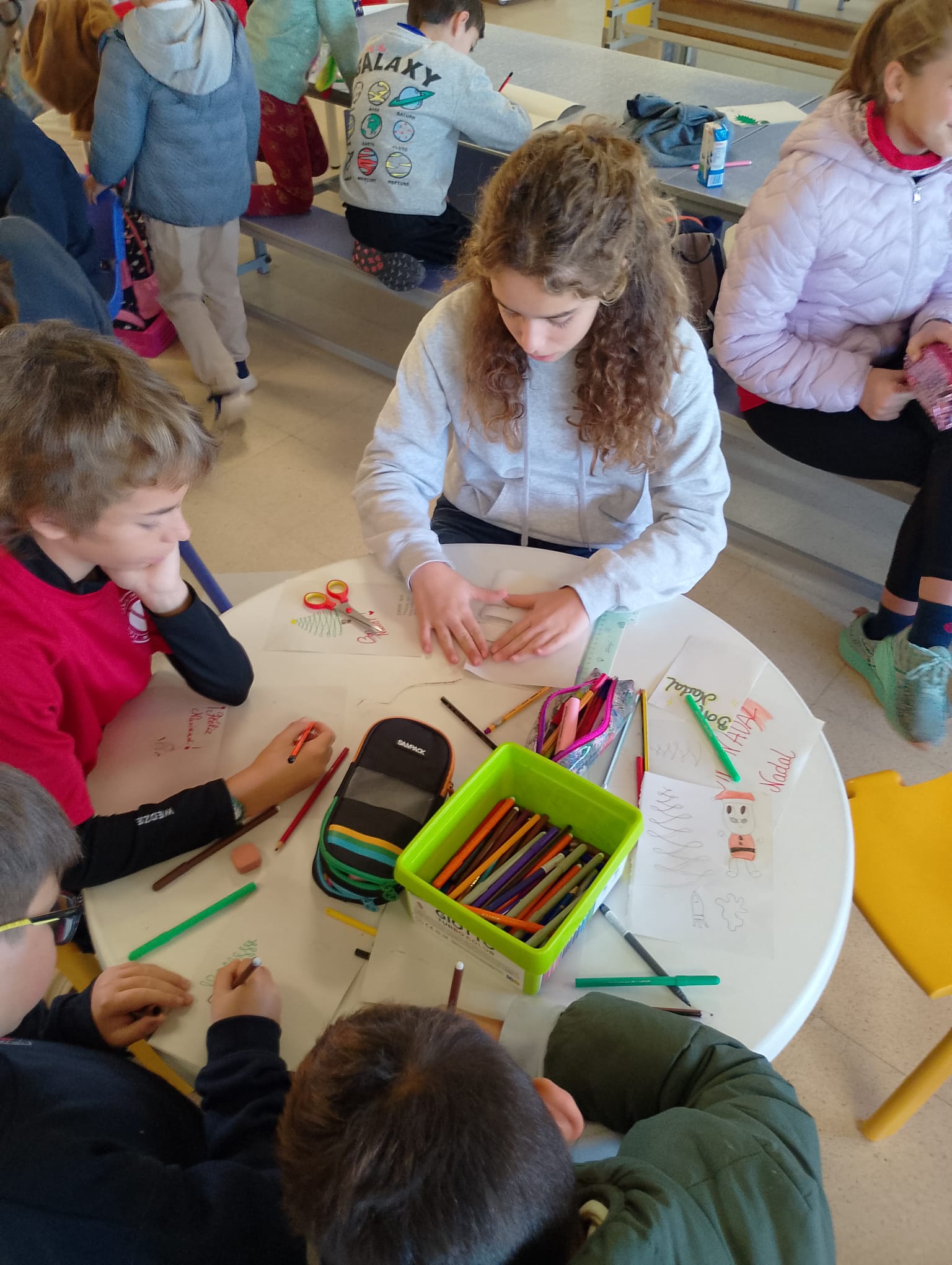 La realització de les postals nadalenques s’ha desenvolupat durant el moment d’acollida matinal, un espai en què els alumnes que ho desitgen poden crear la seva postal i col·laborar amb companys més grans o més petits, compartint idees i donant-se suport mutu.
